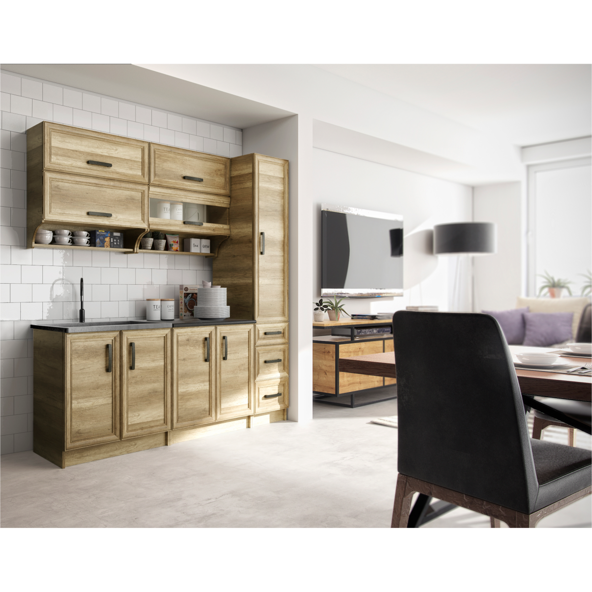 Christina konyhablokk 2 méter széles klasszikus stílusú konyhabútor szett, melyben az állószekrény jelentősen megnöveli a tárolóhelyet. Az üveg szekrényajtó könnyed megjelenést biztosít a konyhablokknak, a szekrények magasságának ellenére, mely 89 cm. A színe természetes fára emlékeztet, mely különös melegséggel tölti meg a konyhát. Konyhagépek, mosogató, csaptelep és dekoráció nélkül árusítjuk!