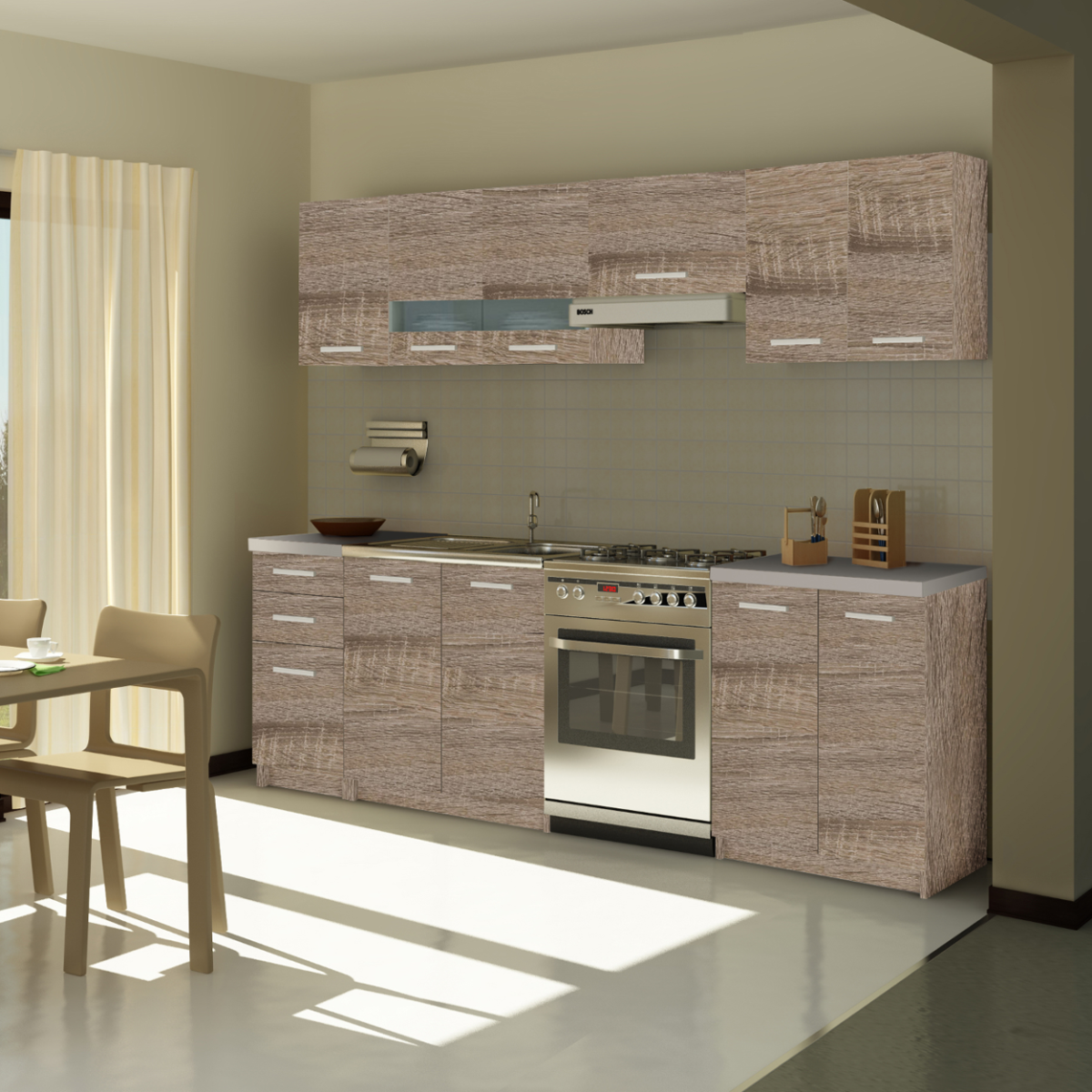 Malaga konyhablokk: alsószekrény mérete: 180x85x45 cm, munkalap mélysége: 60 cm, felsőszekrény mérete: 240x57x31 cm. Színe: Tabac sonoma tölgy dekor.