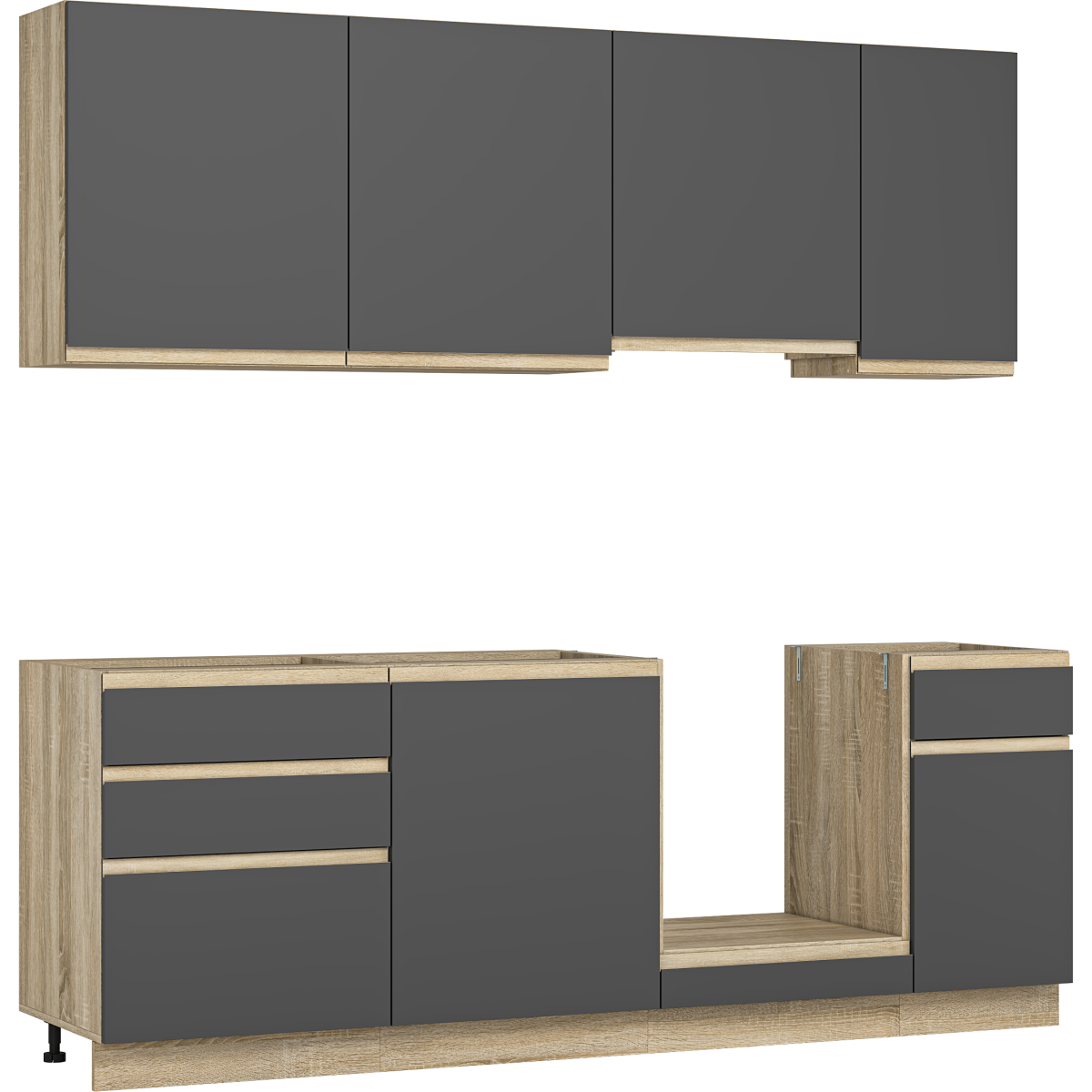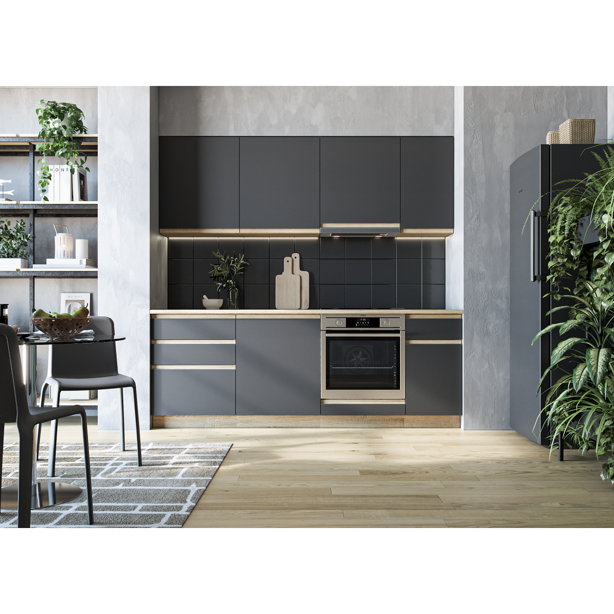 A Manhattan konyhablokk azoknak készült, akik modern, egységes és jól rendszerezhető konyhabútort keresnek – külön elemek összeválogatása nélkül. Az antracit színű előlapok elegáns, időtálló megjelenést biztosítanak, míg a Sonoma tölgy korpusz természetes hatású kontrasztot ad.