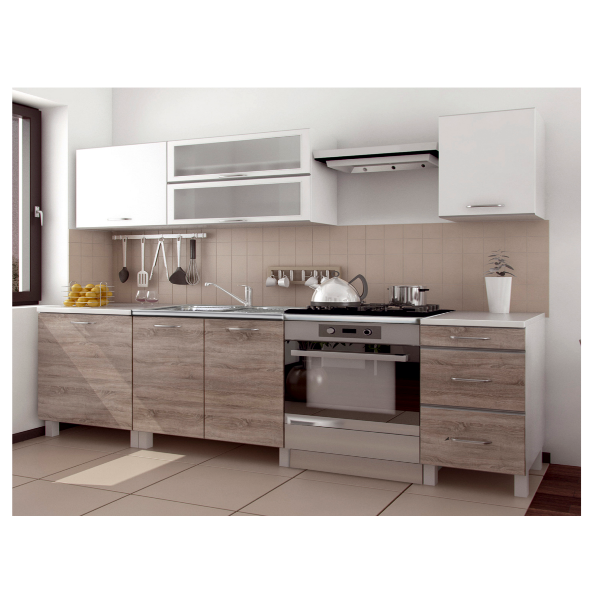 Modern konyhablokk: alsószekrény mérete: 180x81,5x45 cm, felsőszekrény mérete: 180x57x30,6 cm, munkalap mélysége: 60 cm. Színe: sötét sonoma tölgy/fehér dekor. Konyhagépek, mosogató, csaptelep és dekoráció nélkül! A mosogatószekrény elem nem tartalmaz munkalapot.