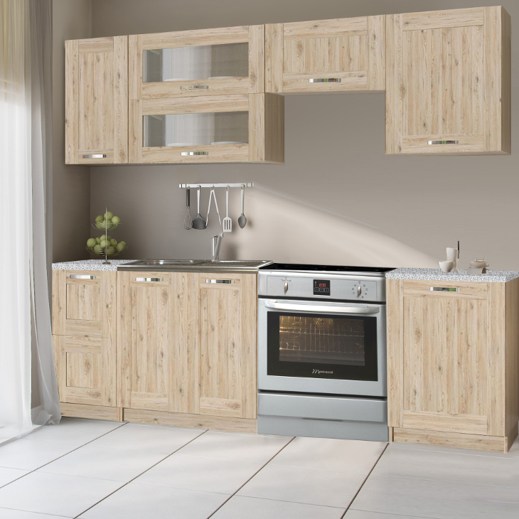 RENEE konyhablokk: alsószekrény mérete: 180x85x45 cm, felsőszekrény: 240x57x32 cm, munkalap mélysége: 60 cm. Színe: San Marino tölgy dekor. Konyhagépek, mosogató, csaptelep és dekoráció nélkül!A mosogatószekrény elem nem tartalmaz munkalapot.