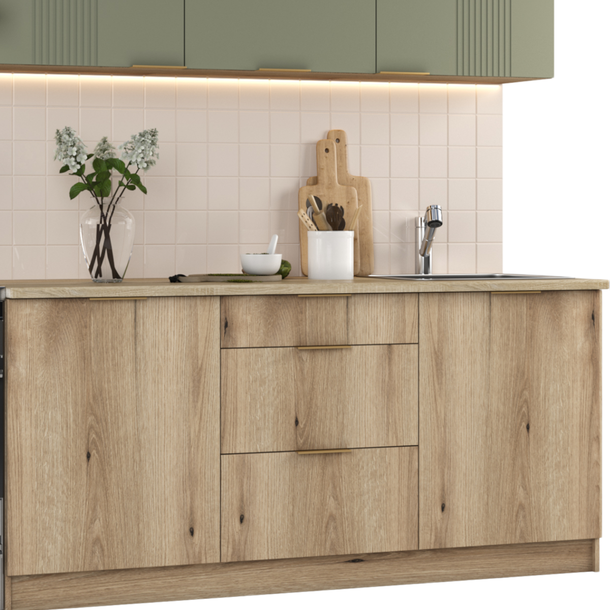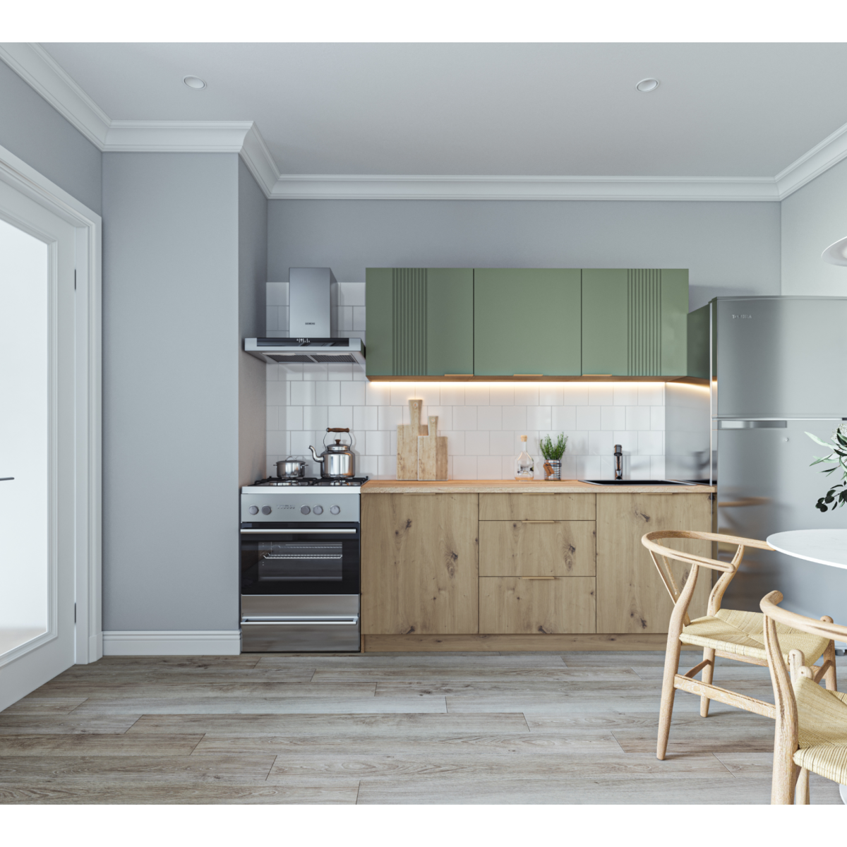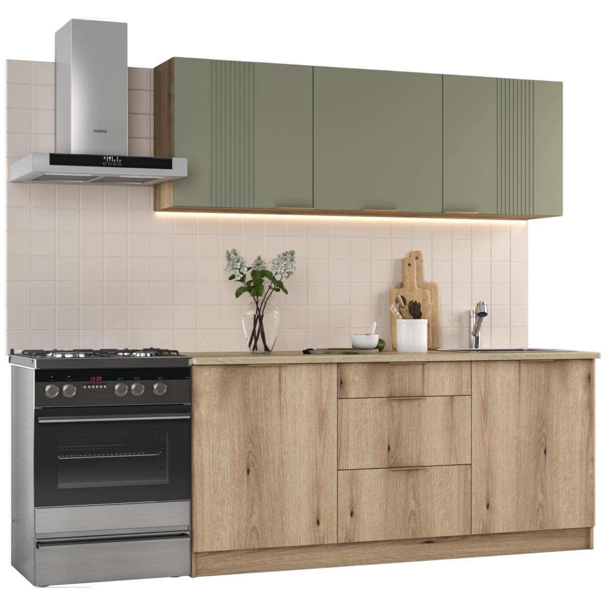 Letisztult, modern megjelenés aranytölgy korpusszal és matt szürkés-zöld frontokkal. A 180 cm széles összeállítás a mindennapi konyhai munkához szükséges fő elemeket tartalmazza, jól kihasználható tárolóhellyel és egységes megjelenéssel.