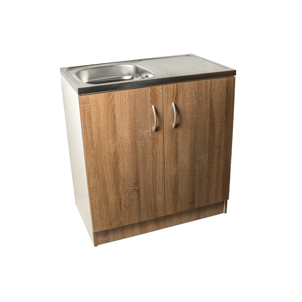 Komplett egymedencés nyílóajtós mosogatós szekrény sötét tölgy fronttal, fehér korpusszal. Mérete: 80x50x83 cm.