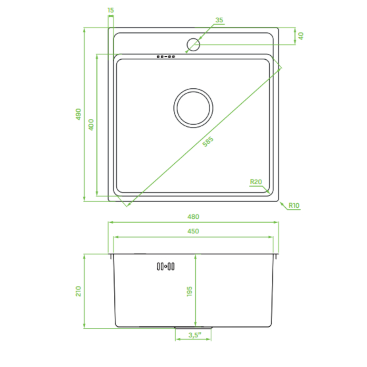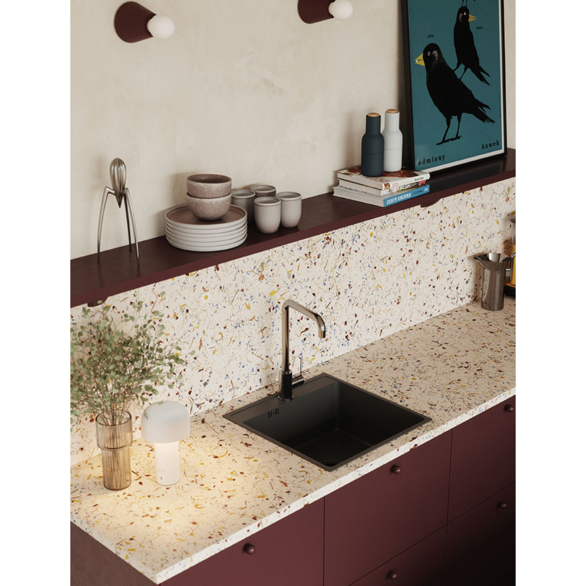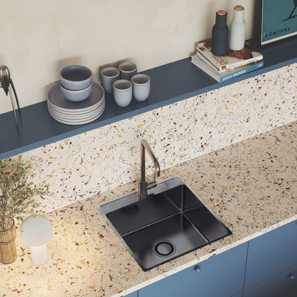 A Kuchinox Laveo Besos egymedencés inox mosogató modern, grafit színű kivitelével elegáns és letisztult megjelenést ad a konyhának. A 48×49 cm-es méret kompakt, mégis kényelmes mosogatási teret biztosít, a 21 cm mélység pedig praktikusan használható mindennapi feladatokhoz. A 20°-os rádiusszal kialakított belső ívek egyszerre esztétikusak és könnyen tisztíthatók.