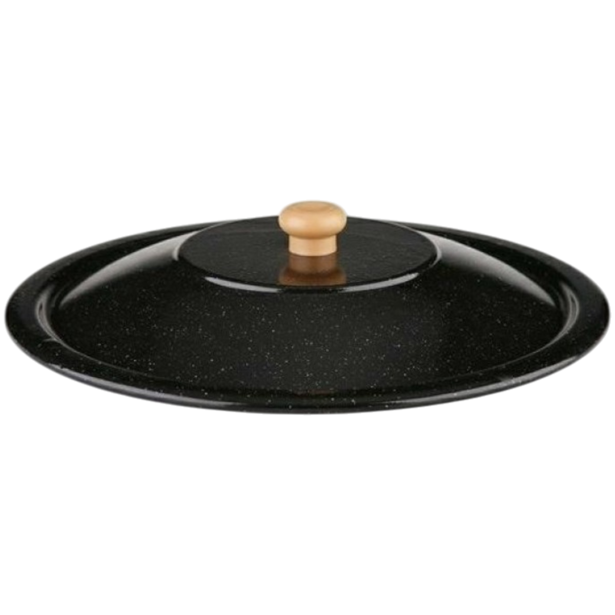 Bográcsfedő 14l-es, zománcozott vas + mŰanyag gomb, átmérője: 38,5cm, súly: 665g. Tisztítása: semleges folyékony mosogatószerrel mossa el, kerülje a karcosodást okozó szerek és eszközök használatát.