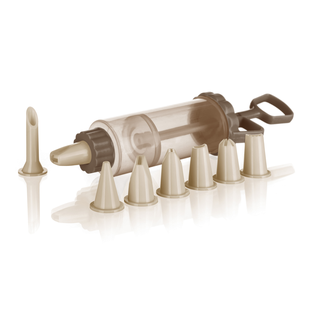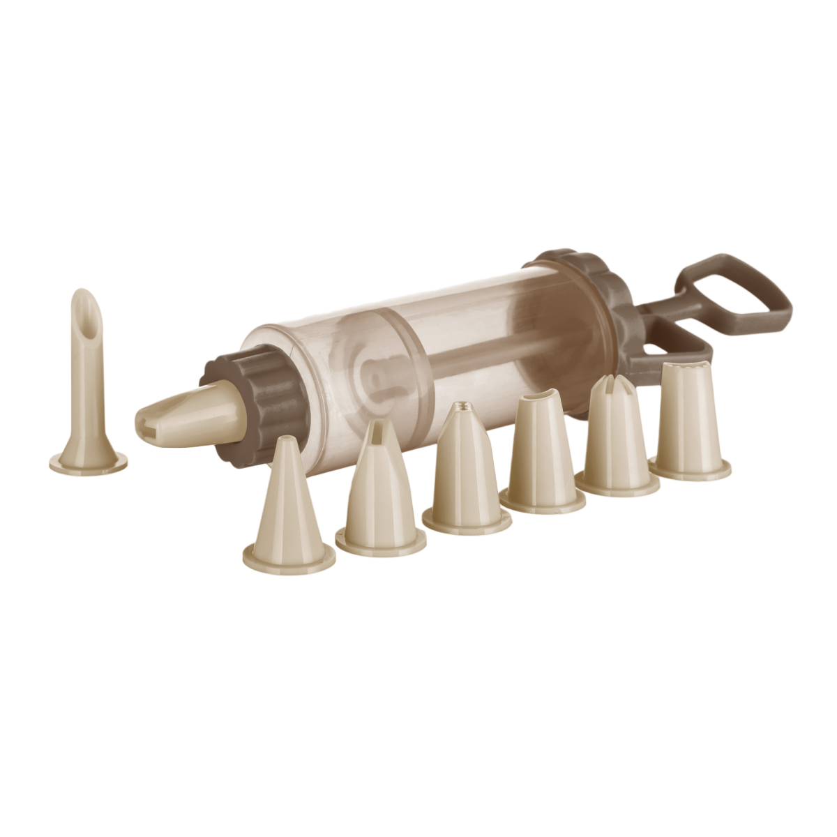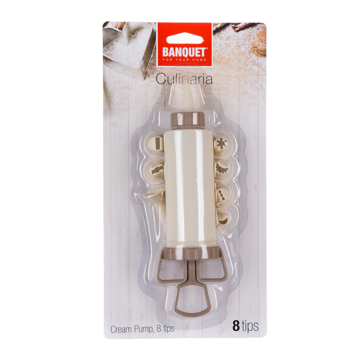 Műanyag habnyomó szett a sütemények kreatív díszítéséhez. A szett egy darab habnyomót és nyolc darab különböző díszítőcsőrt tartalmaz. Mosogatógépben mosható.
