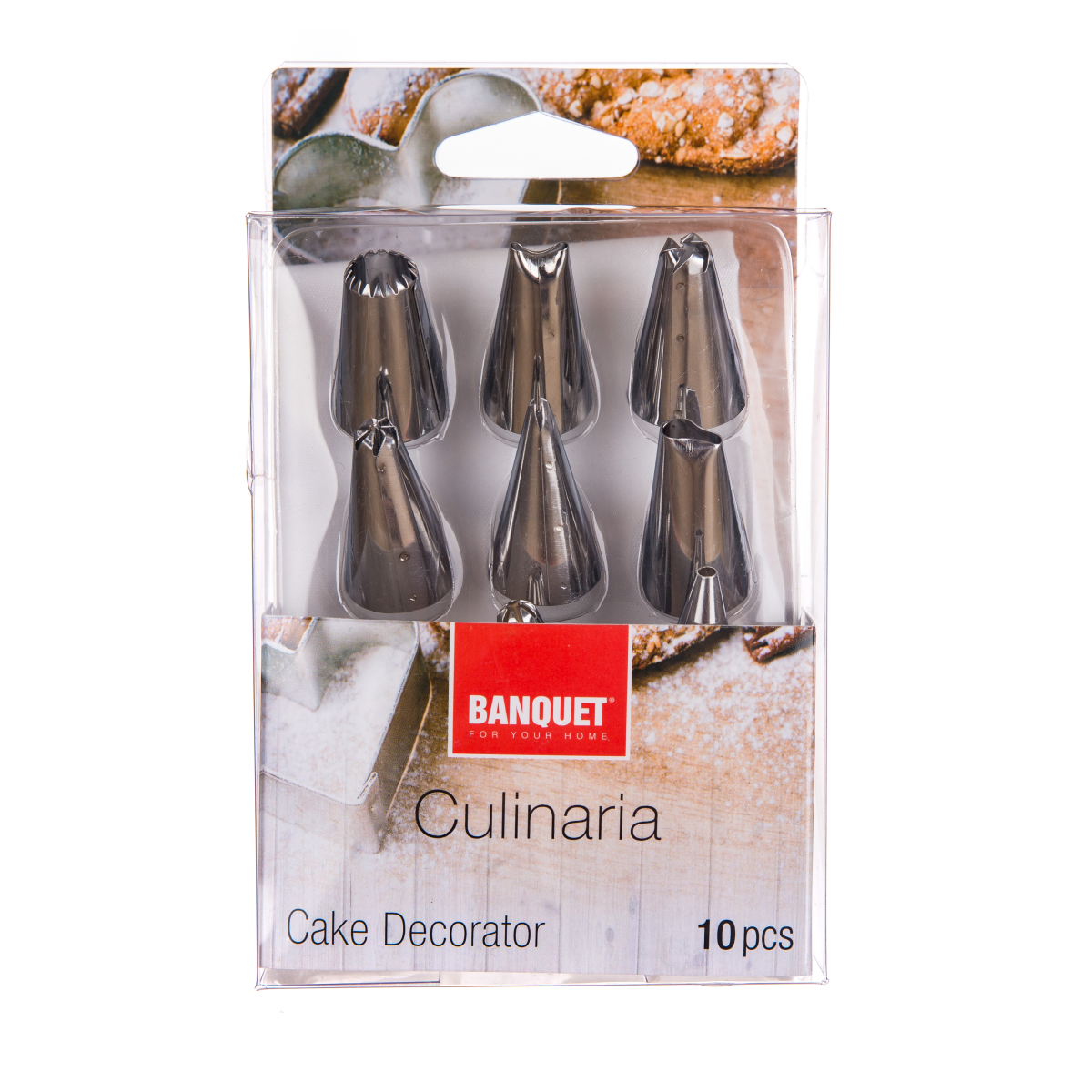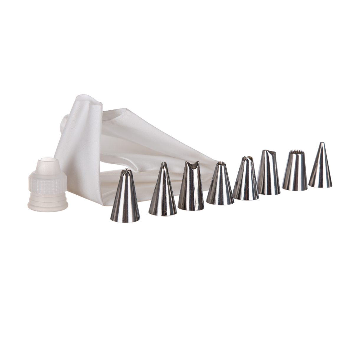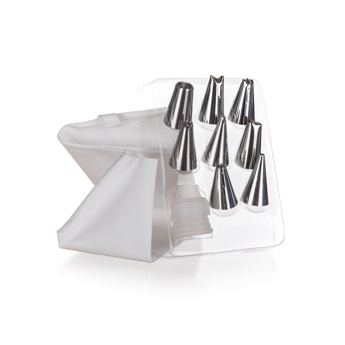 A készlet tartalmaz 1 db díszítőzacskó-műanyagot, egy műanyag kuplung-műanyagot és 8 különböző típusú rozsdamentes acél kiöntőt.