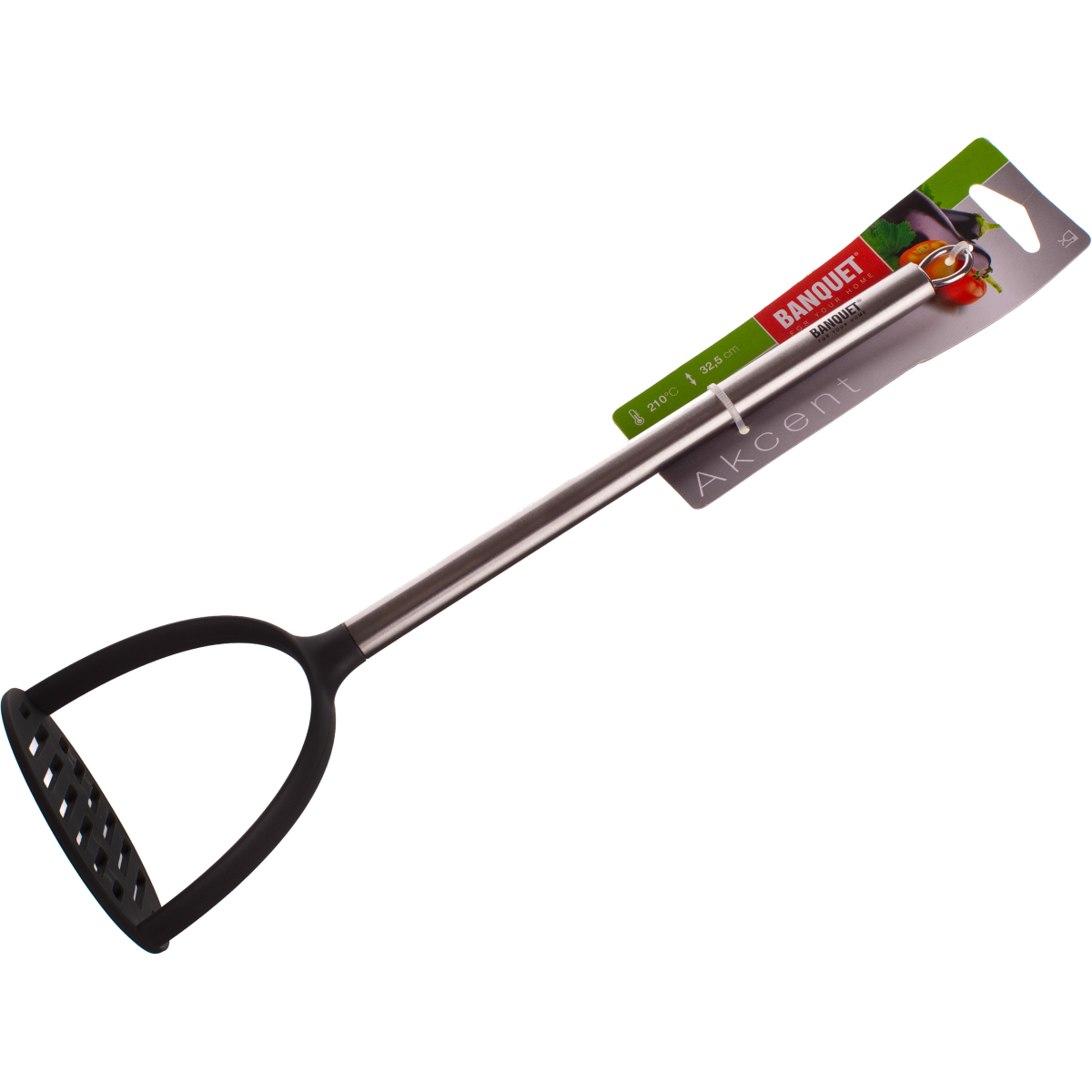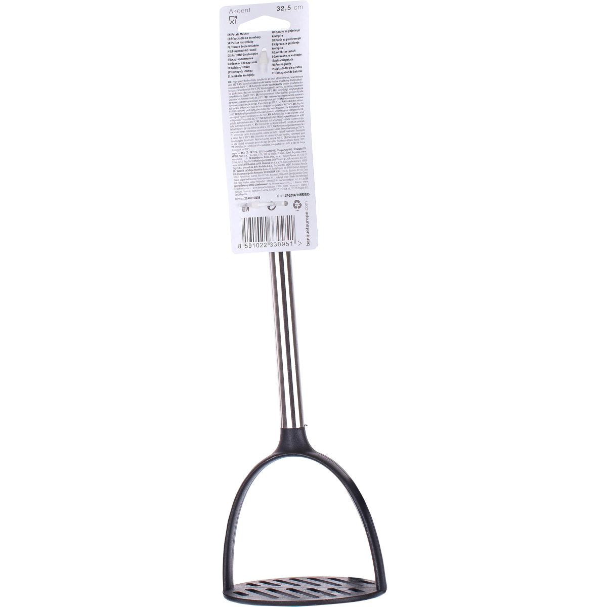 AKCENT burgonyatörő 32,5 cm, anyaga: műanyag, nyele rozsdamentes acél 403, praktikusan felakasztható. Az evőeszköz könnyen karbantartható, mosogatógépben mosható.