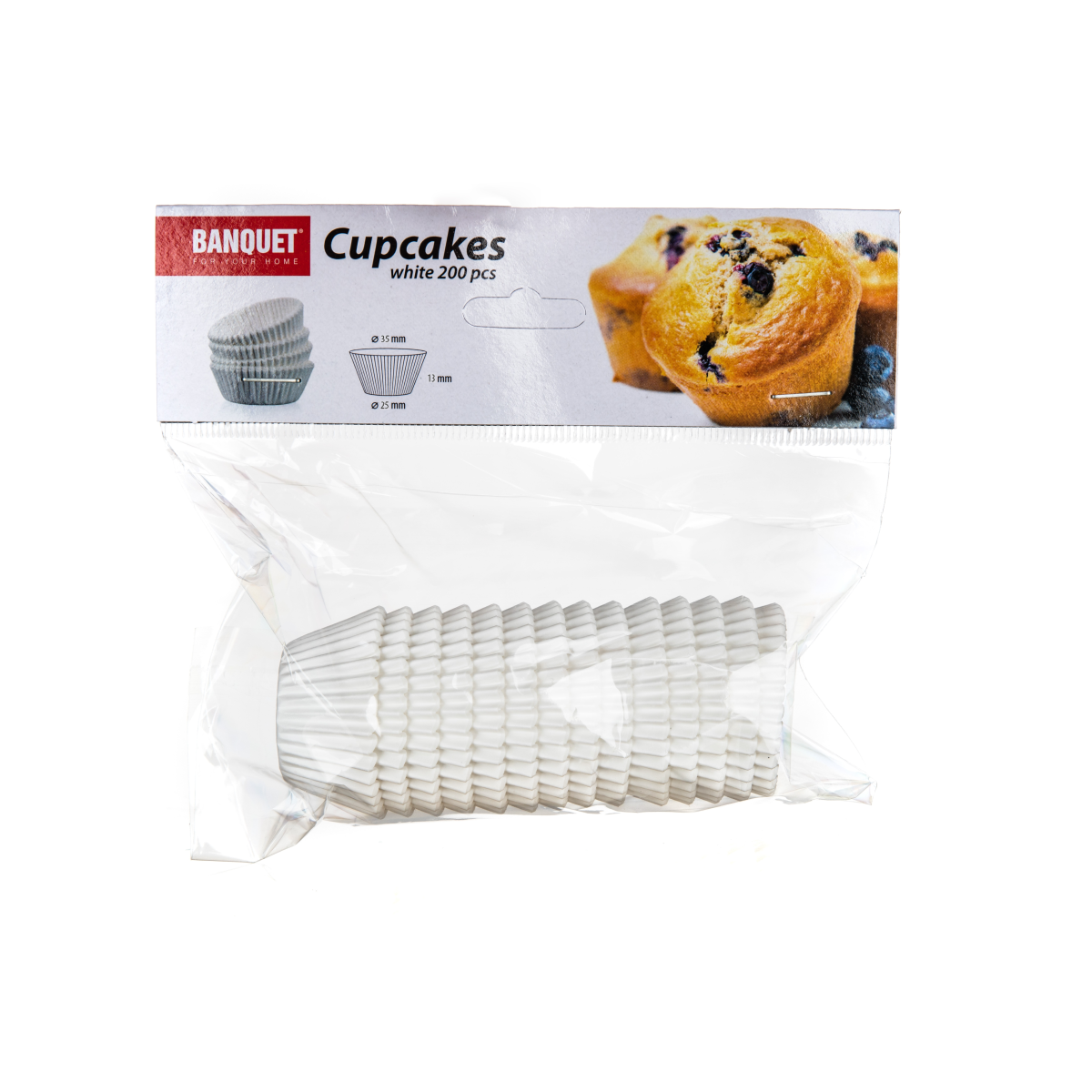 BANQUET cukrász kapszli 200 db-os kiszerelésben. A fehér színű papír muffin kosár felső átmérője 3,5 cm, alsó átmérője 2,5 cm, magassága 1,3 cm. A muffin papírok muffinok vagy hagyományos töltött kosárkák sütésére és felszolgálására szolgálnak.