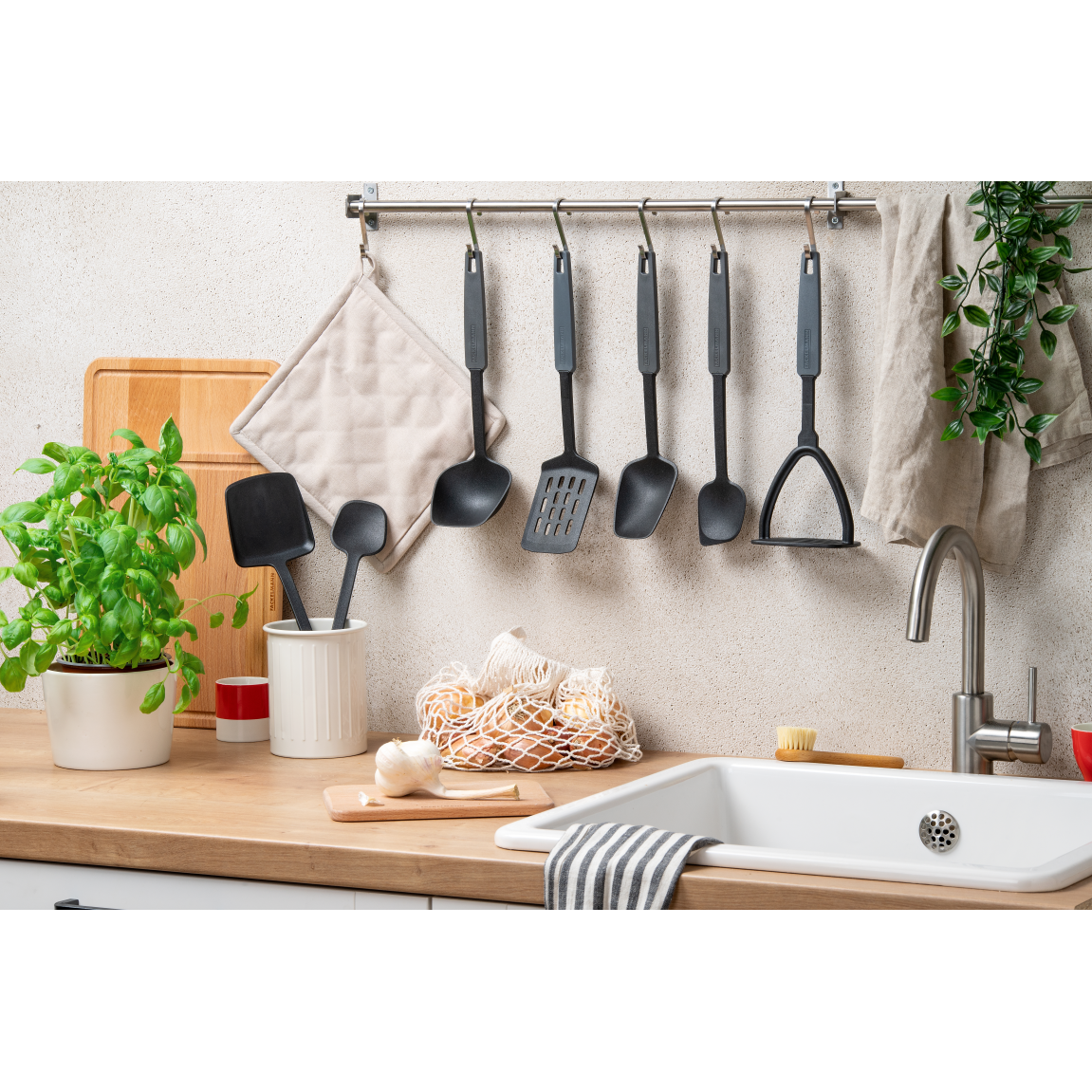 A Fackelmann hegyes főzőkanál egy praktikus konyhai segédeszköz. Ételek elkészítéséhez és keveréséhez használható. Tapadásmentes edényekhez alkalmazható. Lapos, vékony kialakításának köszönhetően helytakarékosan felakasztható vagy fiókban tárolható. Főzés után mosogatógépben mosható. Minőségi, tartós műanyagból készült, 270 °C-ig hőálló. A fogantyú újrahasznosított anyagból készült (ISCC minősítésű).