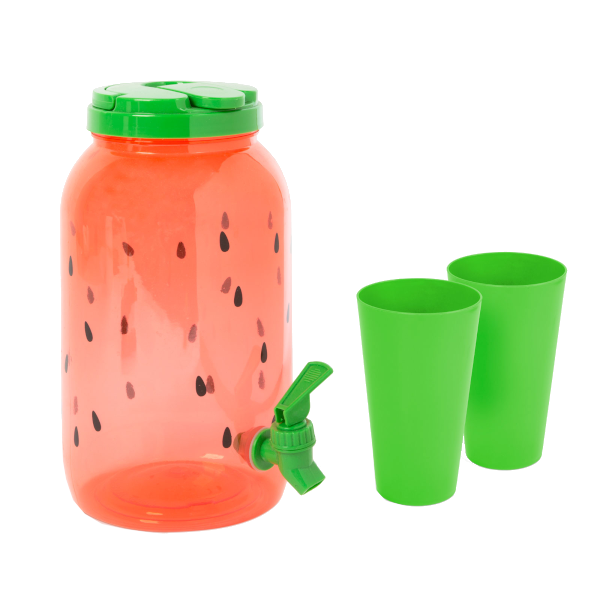 Születésnapokhoz, kerti partykhoz tökéletes választás. Ideális sör, koktélok, long drinkek, gyümölcslevek csapolásához. Kiváló védelmet nyújt a rovarok, méhek és darazsak ellen. Hordozófüles, lecsavarható fedéllel, adagoló csappal. Űrtartalom 3,8 liter, 2 db 280 ml pohárral. Anyaga: műanyag. Forró italok tárolására nem alkalmas! Mikróhullámú sütőbe nem tehető!
