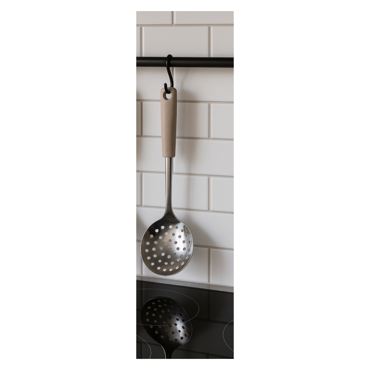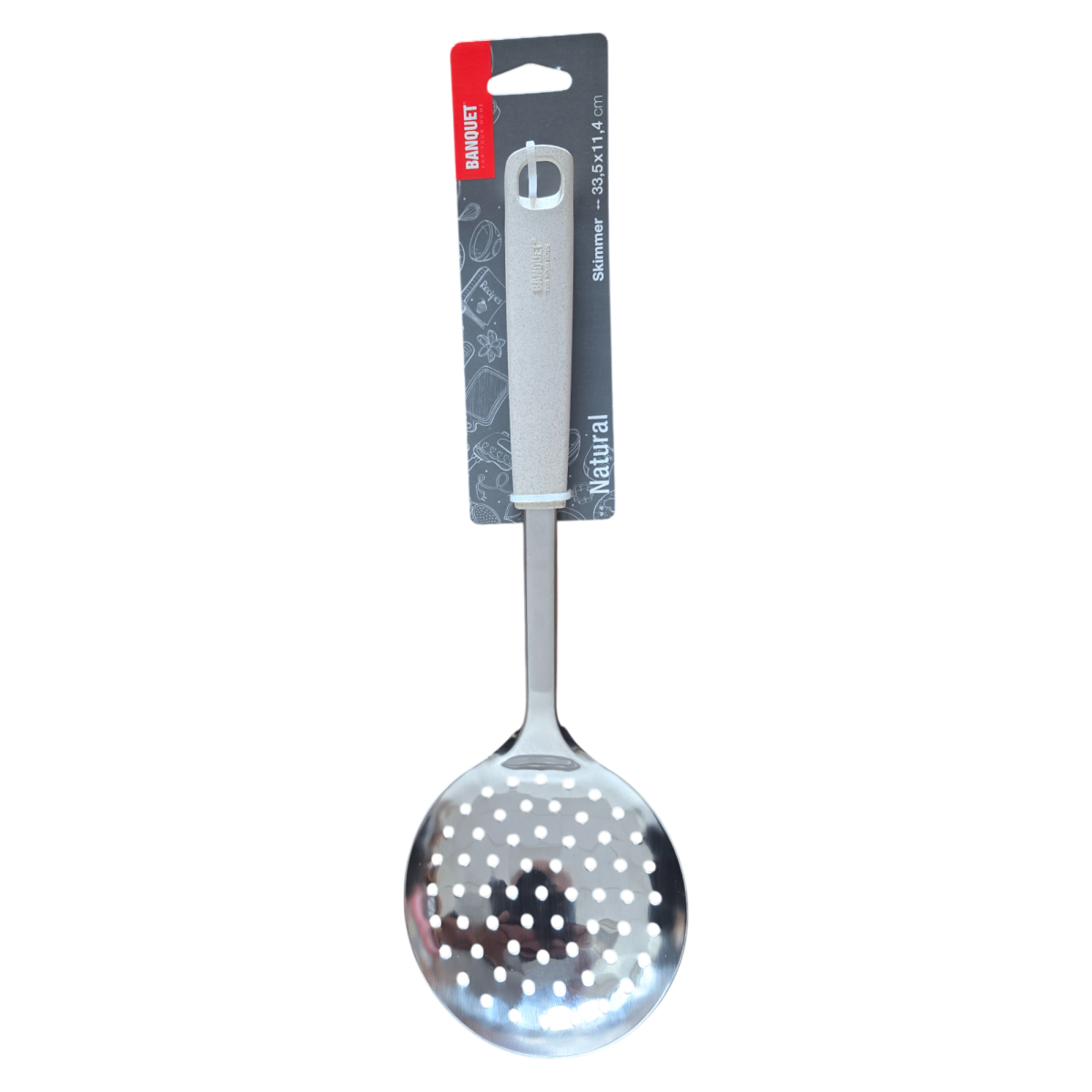 A Natural szűrőkanál alkalmas professzionális és otthoni felhasználásra is – a Natural termékcsalád minden darabját a megbízhatóság és az egyszerű funkcionalitás jellemzi. A szűrőkanál praktikus akasztófüllel rendelkezik, így könnyedén tárolható, a mosogatógépben való tisztításnak köszönhetően pedig a karbantartása is egyszerű. A markolat a környezettudatosság jegyében a polipropilén mellett természetes anyagból (búzakorpából) készül a műanyag-felhasználás csökkentése érdekében