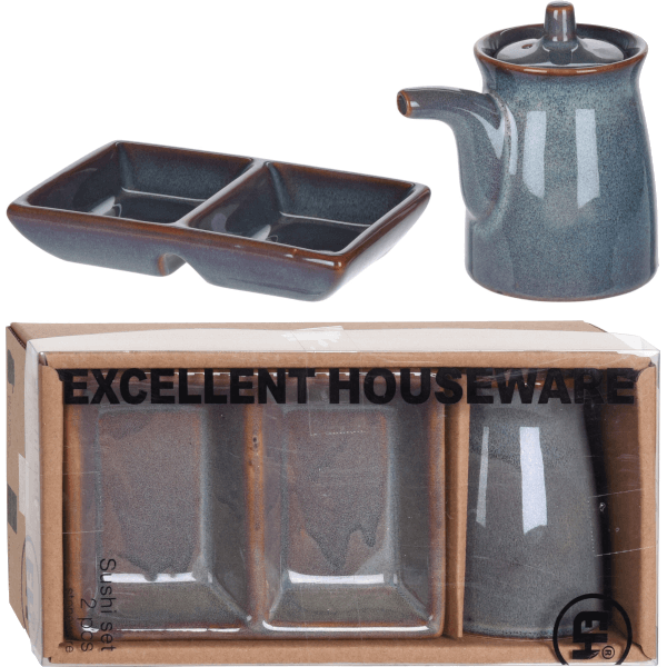 Kerámia sushi szett, kék színben. 2 db/ szett, kiöntő: 180 ml, 1 tartó:13x85x25 cm.