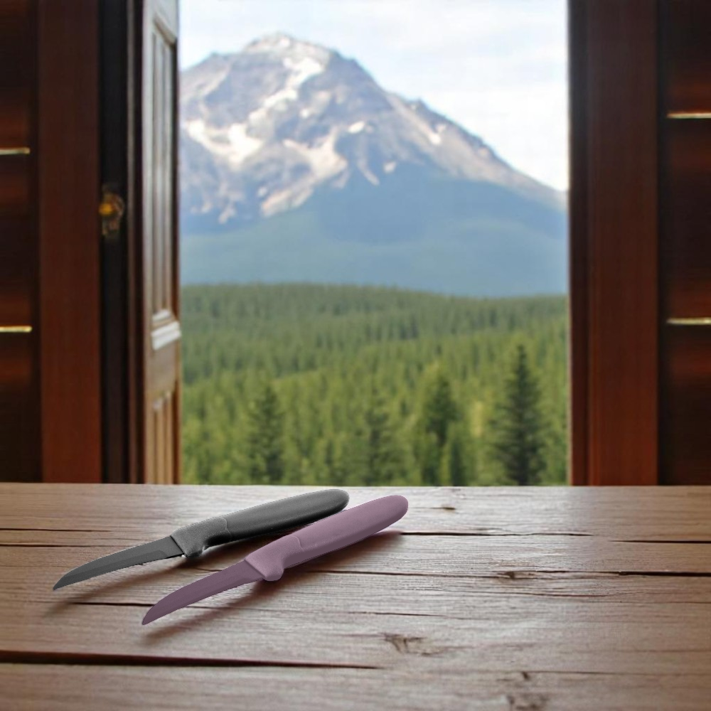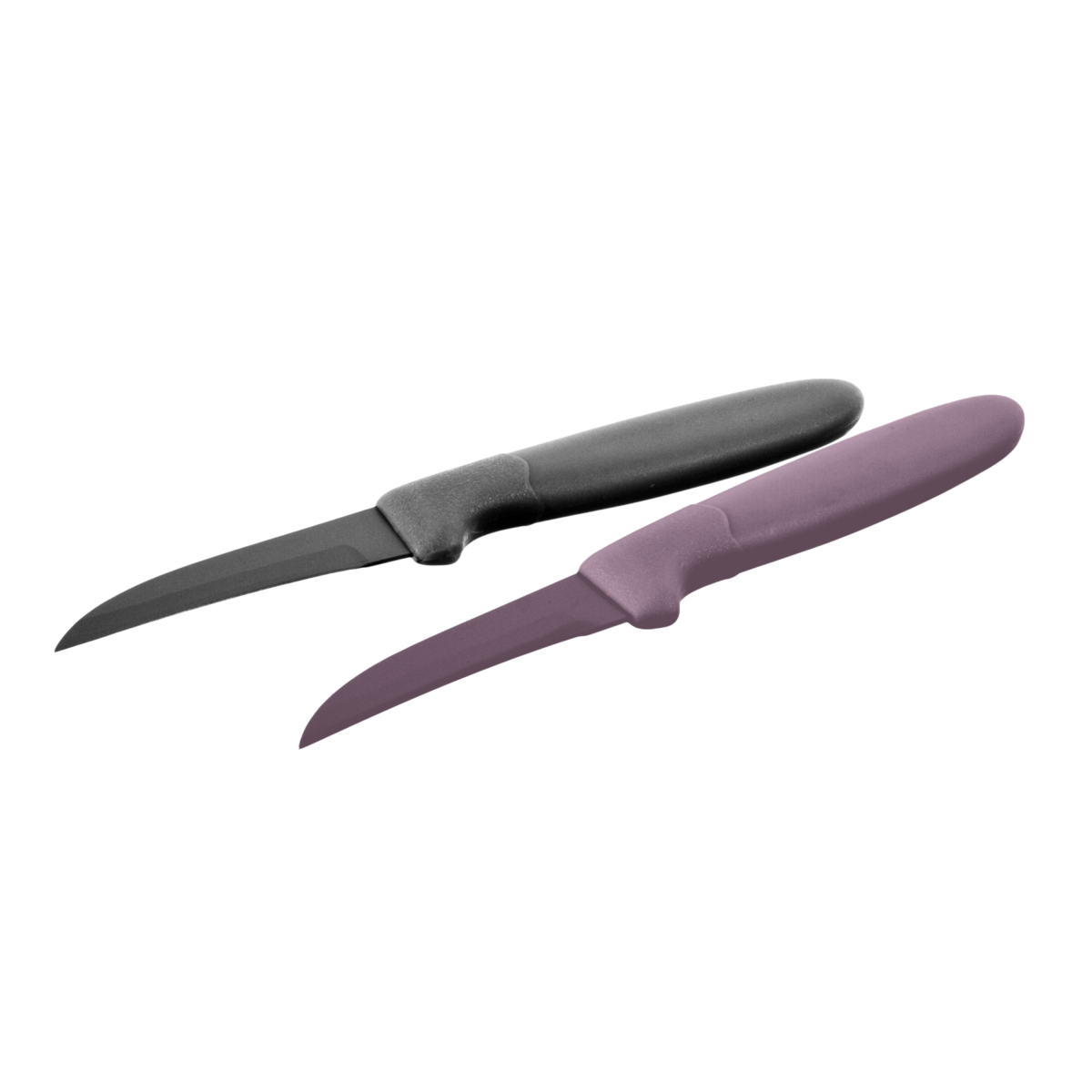 A kényelmes műanyag nyél kétféle színváltozatban – lila és fekete – érhető el, így a stílusodhoz és konyhádhoz is könnyen igazítható. A kés kis mérete és könnyű kezelhetősége révén tökéletes választás lehet mindennapi használatra.