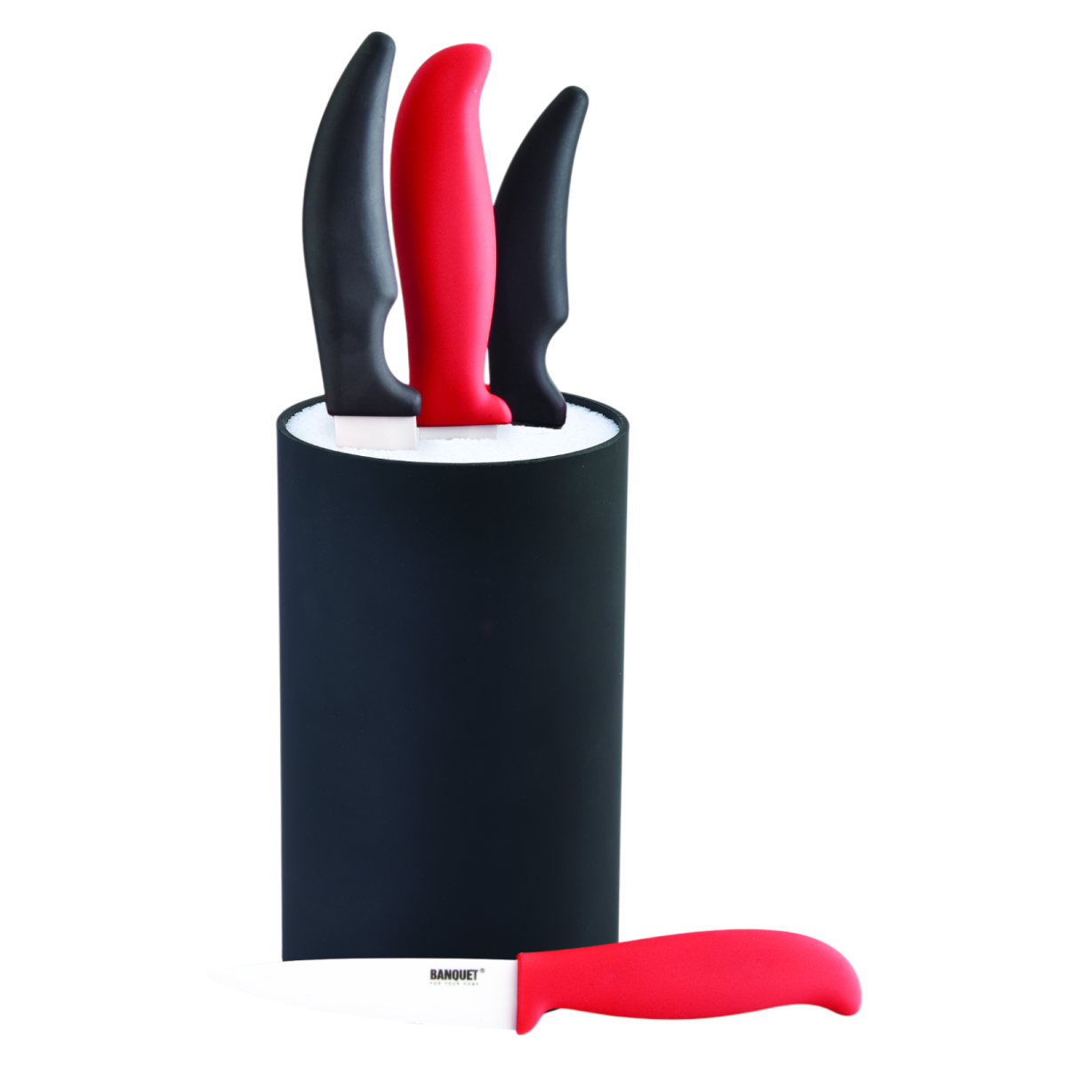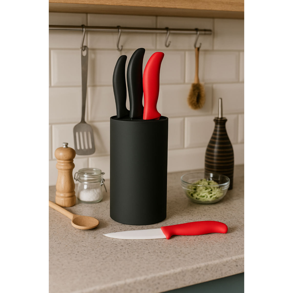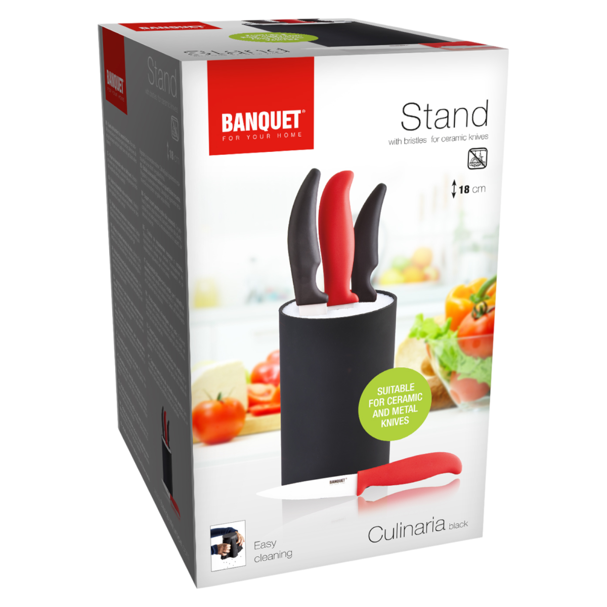A Culinaria 18 cm magas fekete késtartó ideális választás, ha kerámiakések vagy más kések biztonságos és rendezett tárolására keresel megoldást. A hengeres műanyag testben egy kivehető sörtés betét található, amely lehetővé teszi, hogy a kések élét megóvd a tárolás során fellépő mechanikai sérülésektől. A betét könnyen tisztítható.