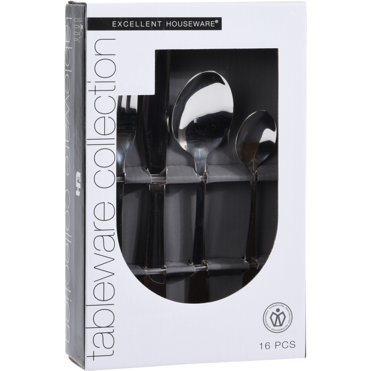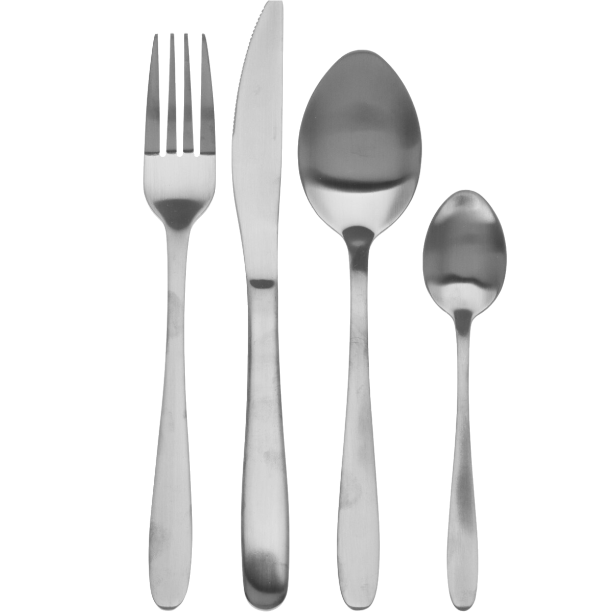 Rozsdamentes acél evőeszköz készlet. A szett 16 darab evőeszközt tartalmaz: 4 db kés, 4 db villa, 4 db kanál, 4 db teáskanál.