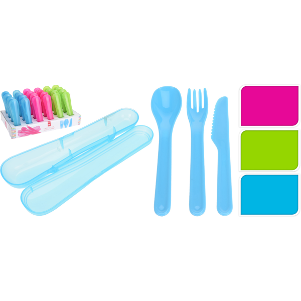 3db-os evőeszköz szett+ tartó, anyaga: műanyag. Mérete: 190x45x36 mm. A kanál mérete: 175 mm, a kés mérete: 175 mm, a villa mérete: 175 mm. 3 féle színben (zöld/kék/pink) értékesítjük.