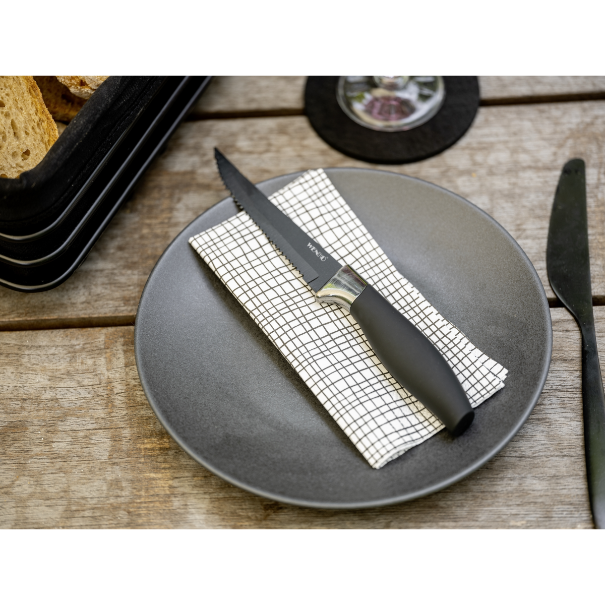 Ezek a kifinomult konyhai kiegészítők nem hiányozhatnak a BBQ és grill-rendezvények kültéri konyhájából. A Wenko 4 darabos Otis steak késkészlet egy elengedhetetlen eleme a grillezésnek. Az elegáns kvartett néhány dologban felülmúlja a hagyományos késeket: a rozsdamentes acélpenge fogazott élének köszönhetően könnyedén és foszlás nélkül vágja át a hússzeleteket, a grillezett ételeket és még a pizzát is. A kiváló minőségű műanyagból készült ergonomikus markolat kényelmes kezelhetőséget és könnyű vágást biztosít. A steak kések nem csak ügyességükkel nyűgöznek le, hanem ezek igazi fénypontjai az étkezőasztalnak. A markolat és a penge fekete színezése modern, elegáns megjelenést kölcsönöz nekik. Ez lehetővé teszi, hogy a késeket csodálatosan kombinálhassa a Black Outdoor sorozat többi konyhai eszközével.