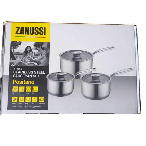 Zanussi Positano nyeles lábas szett . Rozsdamentes 18/10-es acélból készült, minden tűzhely típuson alkalmazható, tartalmaz: 16,18 ill. 20cm-es nyeles lábast, fedővel.