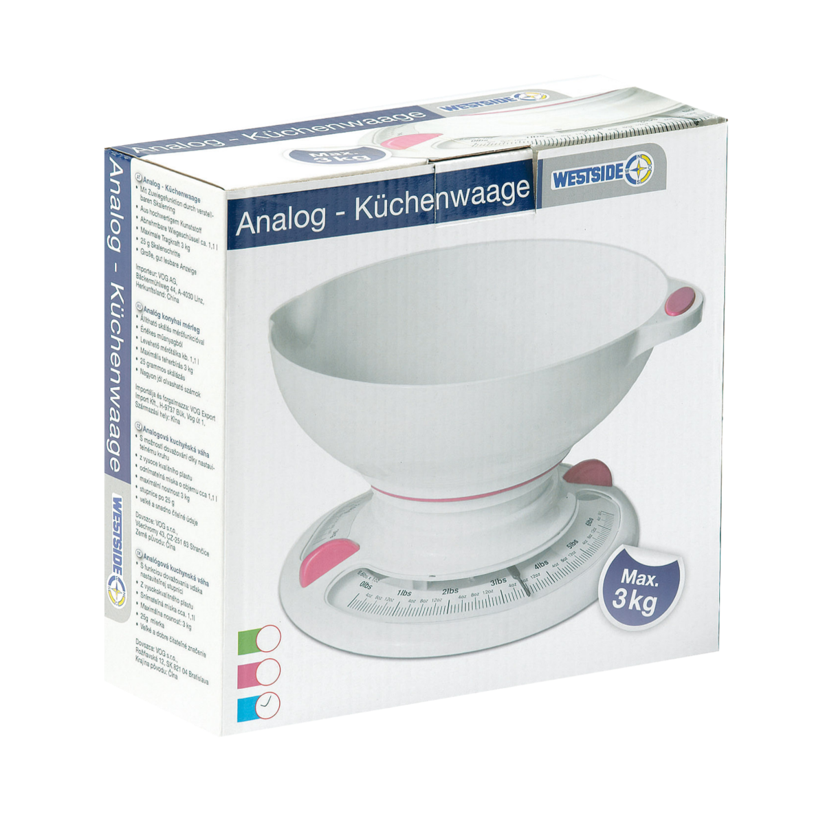 Analóg konyhai mérleg, max 3 kg-ig mér. Mérete kb. 23x20 cm.