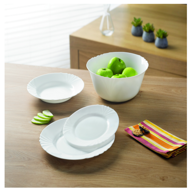 Cadix étkészlet 19 részes, fehér. 6 db lapos, 6 db mély, 6 db desszertes, 1 db salátás tányér.
