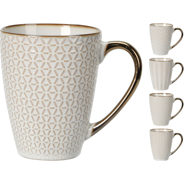 Kerámia bögre, anyaga: kerámia, űrtartalma: 330ml. Mérete: 12,5x8,7x11 cm. Használható mikrohullámú sütőben és tisztítható mosogatógépben. 4 féle mintával értékesítjük.