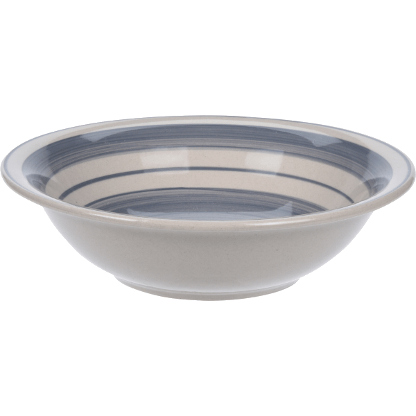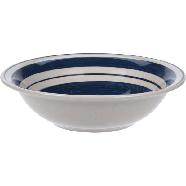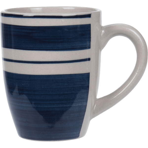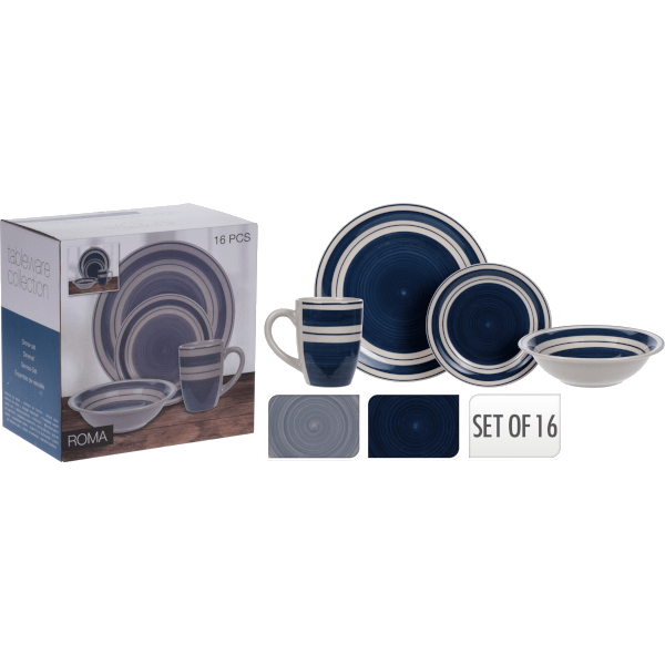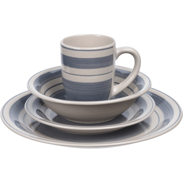 16 db-os kerámia étkészlet csíkos mintával 2 féle színben (sötétkék vagy szürke); 4 db 30x270mm méretű tányér, 4 db 25x195mm méretű kis tányér, 4 db 50x180mm méretű tál, 4 db 270ml-es bögre.