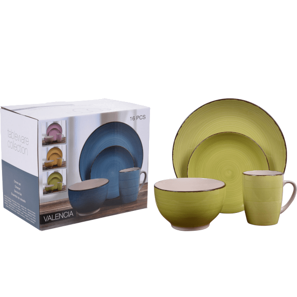 16 db-os sárga színű kerámia étkészlet; 4 db lapos tányér 27 cm átmérővel, 4 db 20 cm átmérőjű kis tányér, 4 db 700 ml-es tálka, 4 db 350 ml-es bögre.