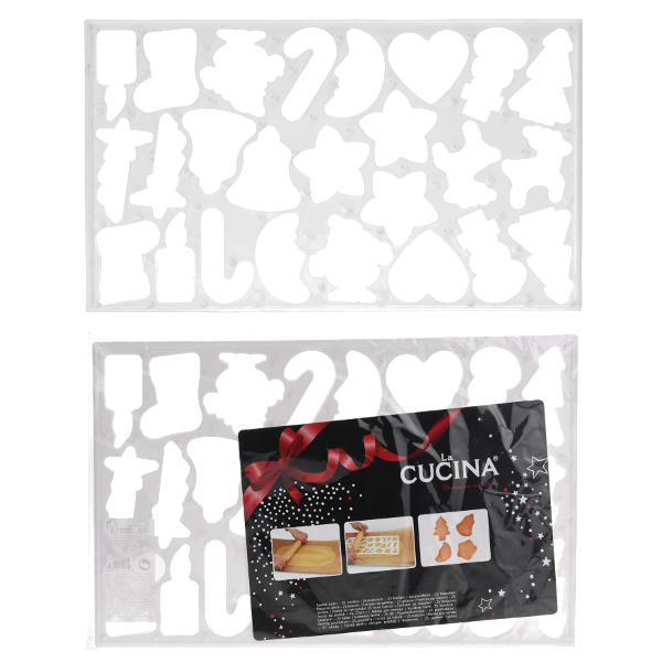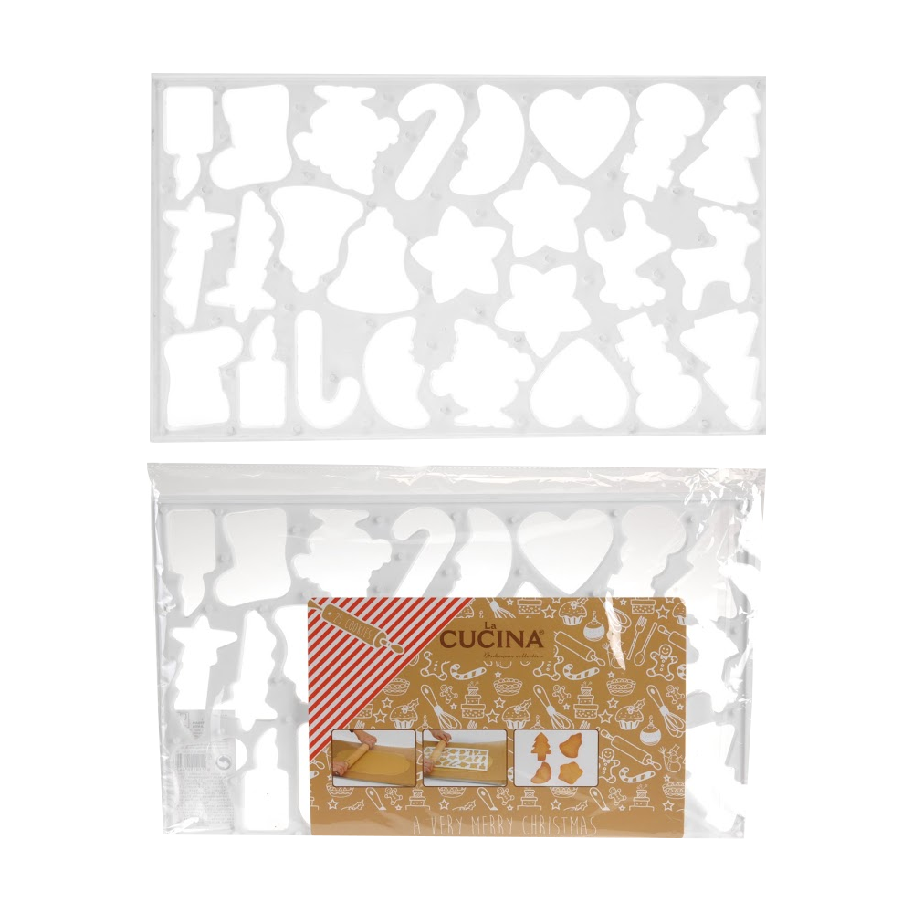 25 sütemény kiszúrására alkalmas szett műanyagból, mérete 37x22 cm, súlya 90 gramm. Fehér színű.