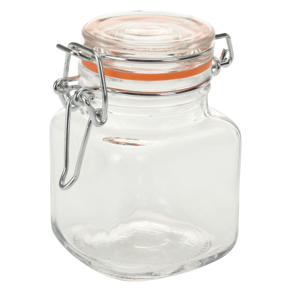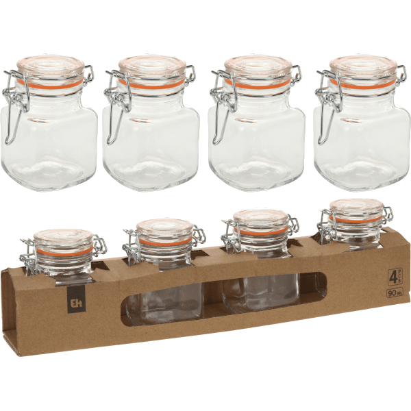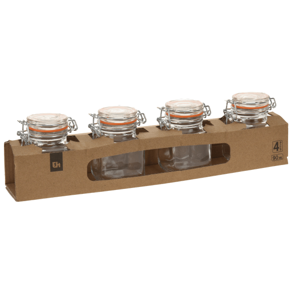 4 db-os 90 ml űrtartalmú befőttes üveg szett fém csipesszel és színes szilikon gyűrűvel; 1 üveg mérete 7x5x5cm; akár fűszertartóként is használható.