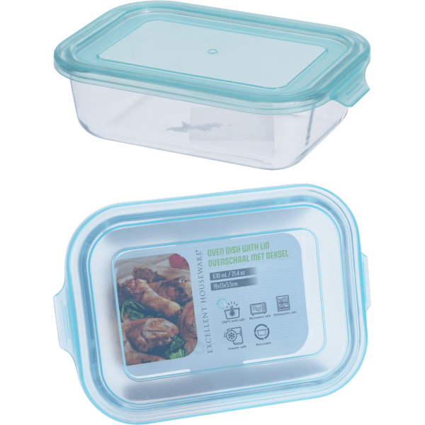 Üveg ételtároló doboz műanyag tetővel, űrtartalom: 630 ml.