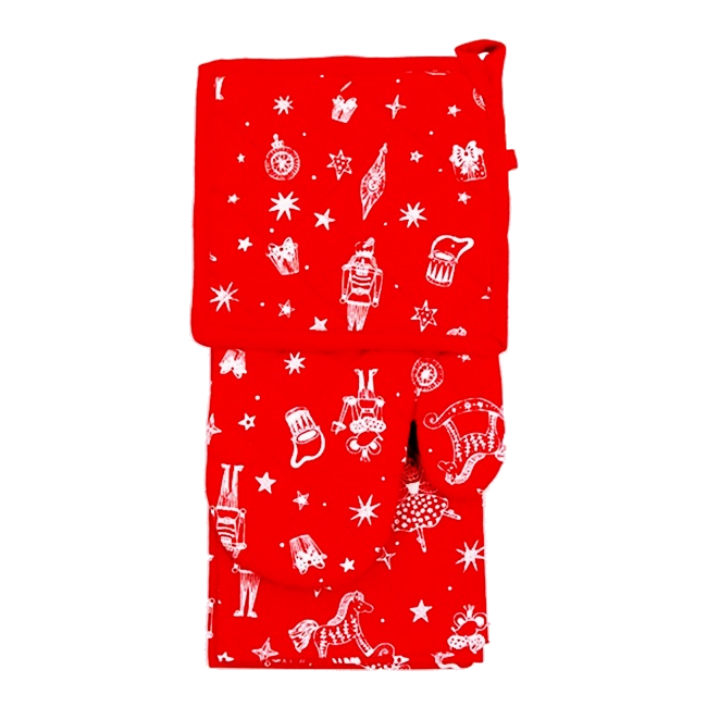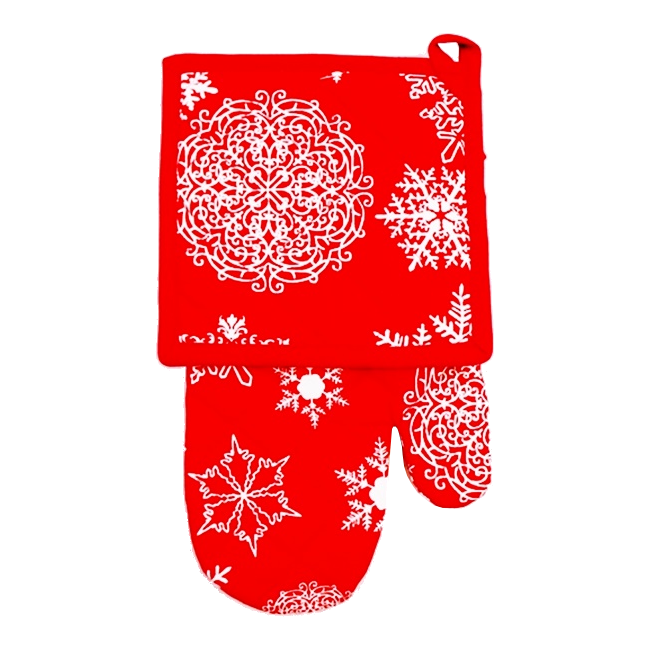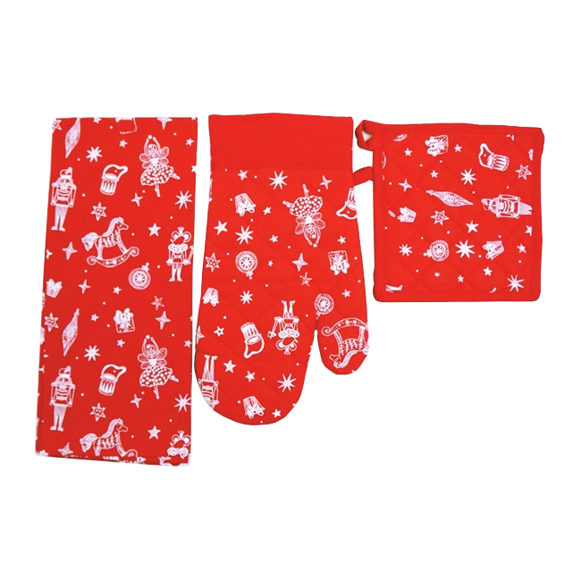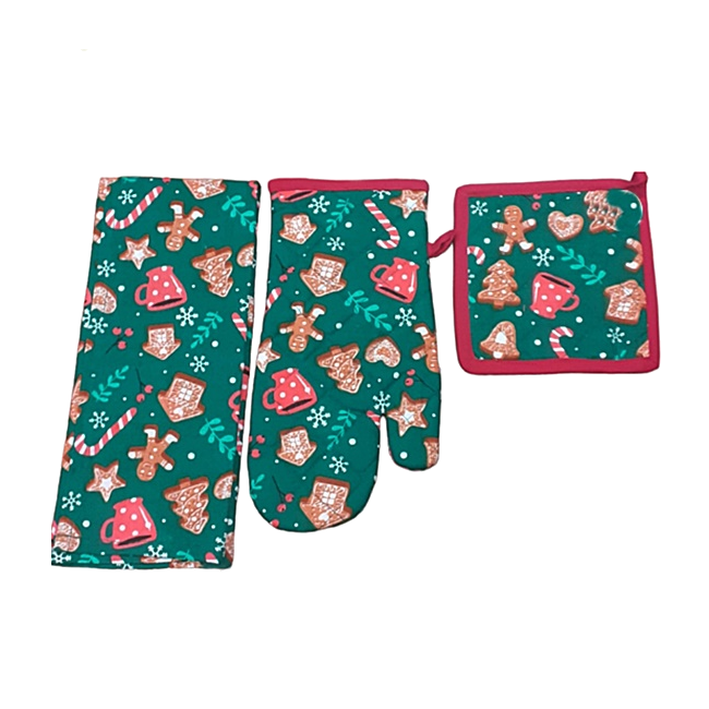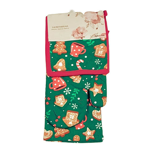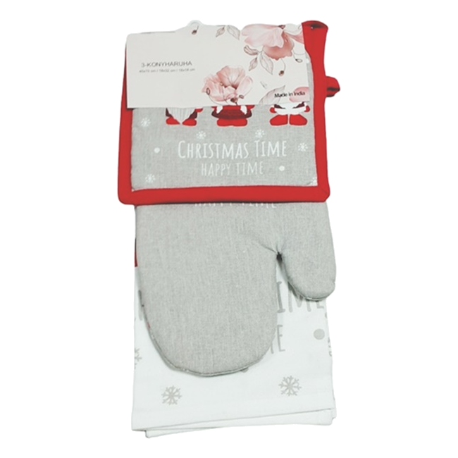 Háromrészes edényfogó szett, négy féle mintával, 100% pamutból. A szett tartalma: 1db edényfogó kesztyű, 1db edényalátét, 1db konyharuha.