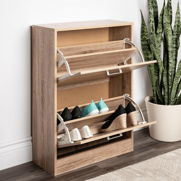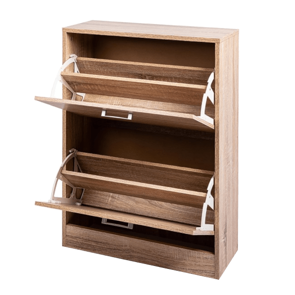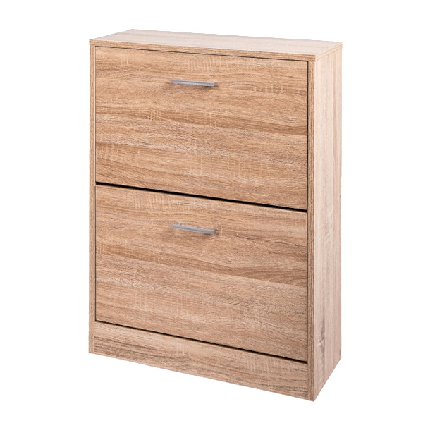 Jesolo cipősszekrény sonoma tölgy dekor. Kis helyigényű, praktikus cipőszekrény két egymás fölött elhelyezkedő, lenyitható fiókkal. Kb 12-15 pár cipő tárolására alkalmas. Mérete: 63x24x81,5cm.