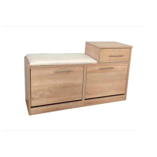 Kis helyigényű, praktikus cipőtároló, elegáns, króm fogantyúval. A kényelmes, bézs színű, műbőr ülőfelület miatt a cipők le- és felvétele még könyebb. Kb. 12 pár cipő tárolására alkalmas. A fiókban a cipőtisztítás kellékeit vagy egyéb apróbb dolgokat lehet tárolni.