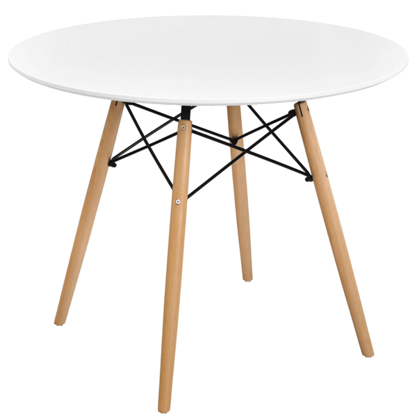 Fehér asztallap, fa lábak. Mérete 80x73x80 cm.
