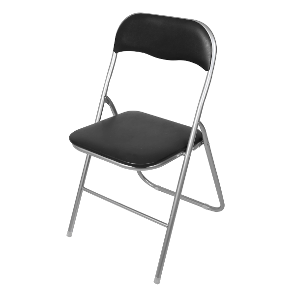 Összecsukható fekete színű szék. műanyag hát- és ülőfelülettel, fém lábakkal; maximum teherbírás: 100 kg.