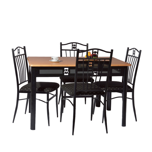 Rimini 4 személyes étkezőgarnitúra. Stabil fekete színű fém váz az asztalnak és a székeknek is egyaránt. A székek textil ülőlapja tökéletes kényelmet biztosít, melynek mintázata fekete alapon apró tűpettyes. Méretek: asztal: 120x76x80cm székek: 41x87x42cm