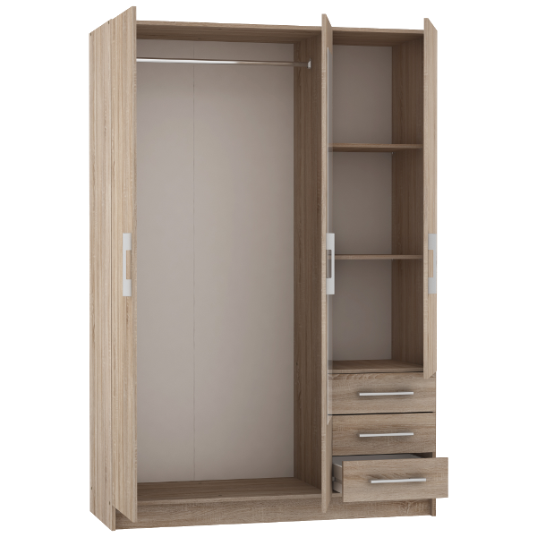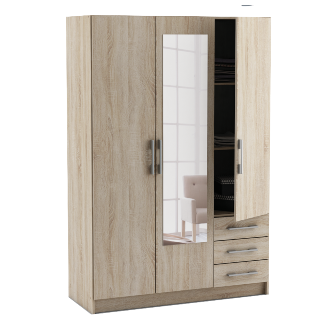 "Champy" tükrös gardróbszekrény 3 ajtóval és 3 fiókkal, sonoma tölgy színű. Mérete: 129x191,5x51,6cm. Csomagolási méret: 1. doboz: 189x43x7,5 cm 2. doboz: 199x51x9 cm