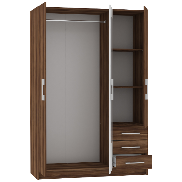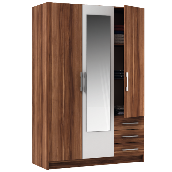 "Champy" tükrös gardróbszekrény 3 ajtóval és 3 fiókkal, dió/fehér színű. Mérete: 129x191,5x51,6 cm. Csomagolási méret: 1. doboz: 189x43x7,5 cm 2. doboz: 199x51x9 cm