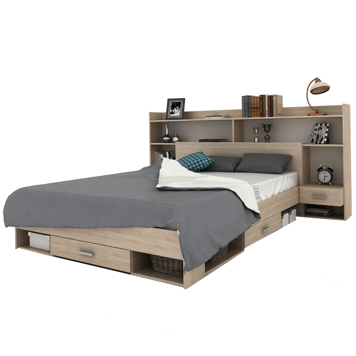 Kombiágy "Line" sonoma tölgy/fehér szín, dekor polcokkal és fiókokkal. Mérete: 229x105x221cm, fekvőfelület:140x200cm. Ágyrács, matrac és dekoráció nélkül!