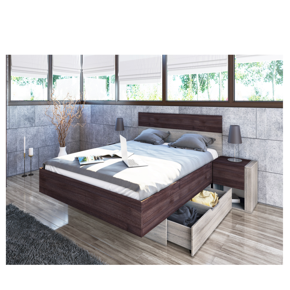 Tica szürke tölgy színű garnitúra, ágykeret + 2 db éjjeliszekrénnyel. Méretek: ágykeret: 164x90x200cm, szekrények: 50x44x42.