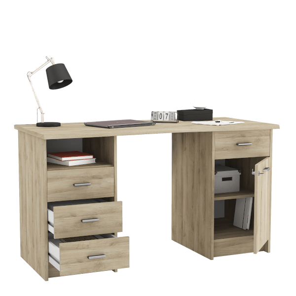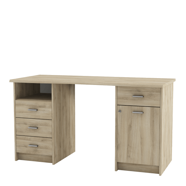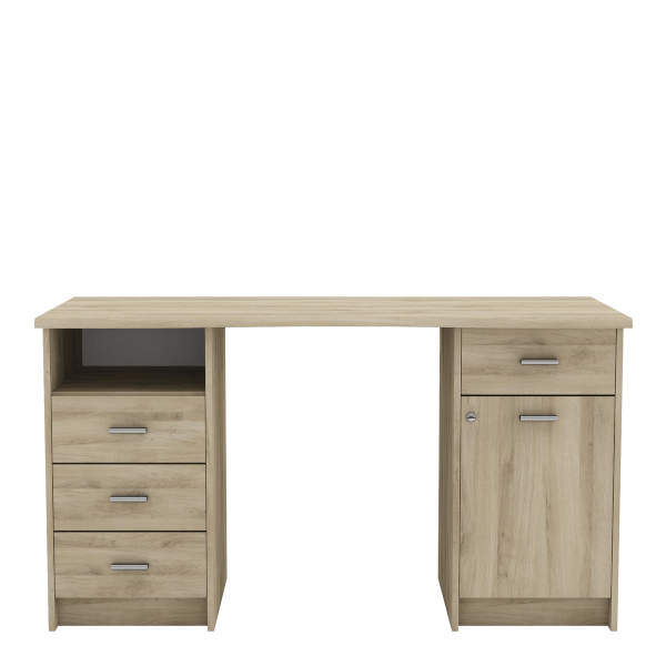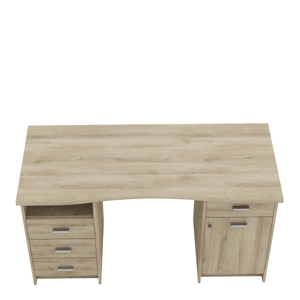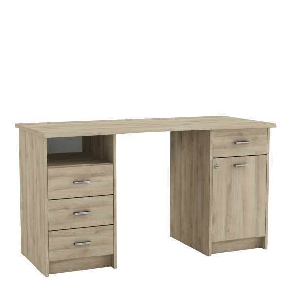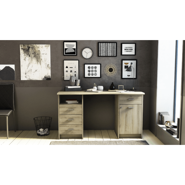 15 mm-es és 22 mm-es forgácslap. A 22 mm-es felső lap középen kissé ívelt (méretek: L134,8cm x D58,4cm x H73,9cm, max. terhelés 33 kg). 4 fiók (méretek: L32 x D39 x H9cm, max. terhelés 2 kg). 1 mélyedés (méretek: L35 x D42 x H15cm, max. terhelés 6 kg). Hely a 2 egység között: 56cm. 1 polc állítható 3 szinten (méretek: L35 x D39cm, max. terhelés 5kg). 1 zárt szekrény. Szürke lakkozott rúd fogantyú.