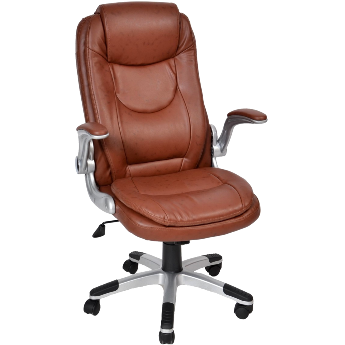 Exclusive megjelenésű, díszvarrásos, magasháttámlás, kényelmes ülőfelületű főnőki forgószék. Puha műbőr ülőfelület és karfa. Dupla komfortos vastag ülőfelület és háttámla, melyek felső rétege puhább anyagból és bőrből készült a lehető leg kényelmesebb használat érdekében. A barna kárpit anyagában fröcskölt mintás. A karfa felhajtható, így könnyedén betolható a szék az iróasztal alá. Beépített hinta mechanikával és gázliftes magasságállítással. Mérete: 62x73x108-118cm, max.: 95kg.