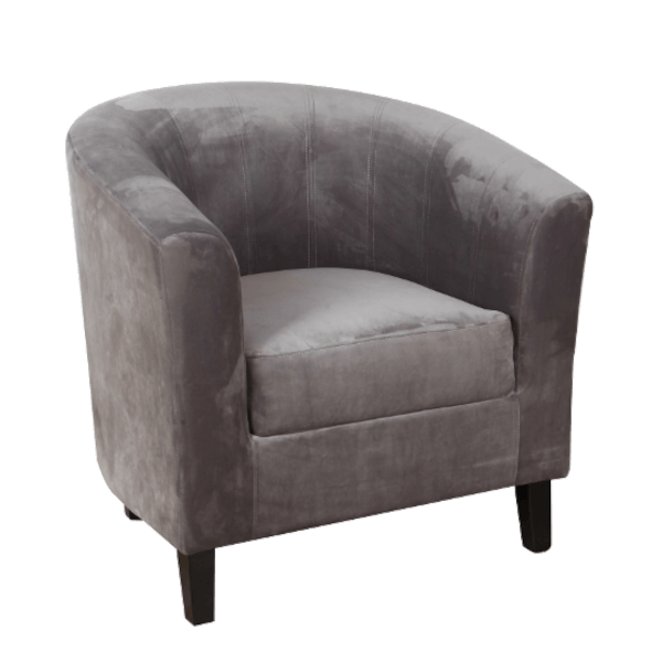 Párnás szürke bársony fotel, fa lábakkal, 76x69x75cm méretben.