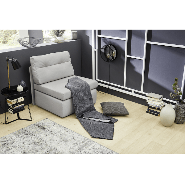 Tunis fotelágy világos szürke színben. Ágyfunkciós fotel, farugón habszivacs kárpitozás, ágyneműtartó, 1 db hátpárnával.