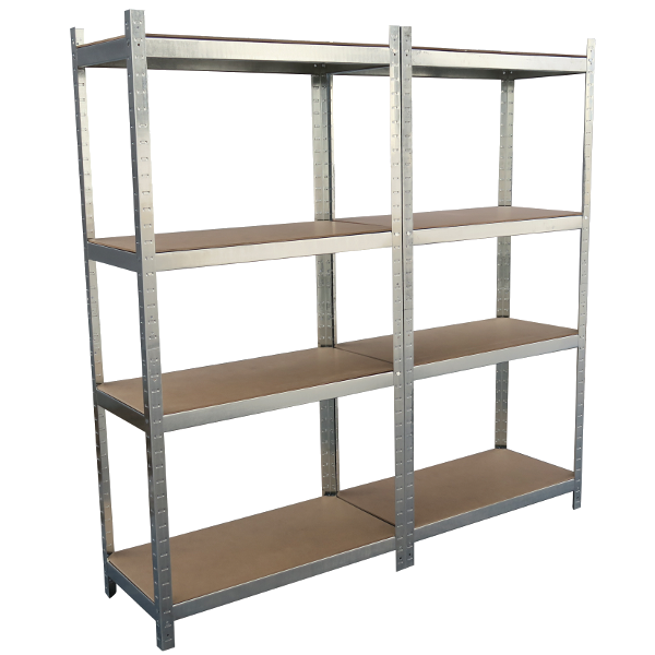 Horganyzott fémpolc, 2x4 MDF polccal, amelynek teherbírása 60 kg/polc. Mérete: 160x160x40 cm. Csomagolási méret: 41x82x9 cm.