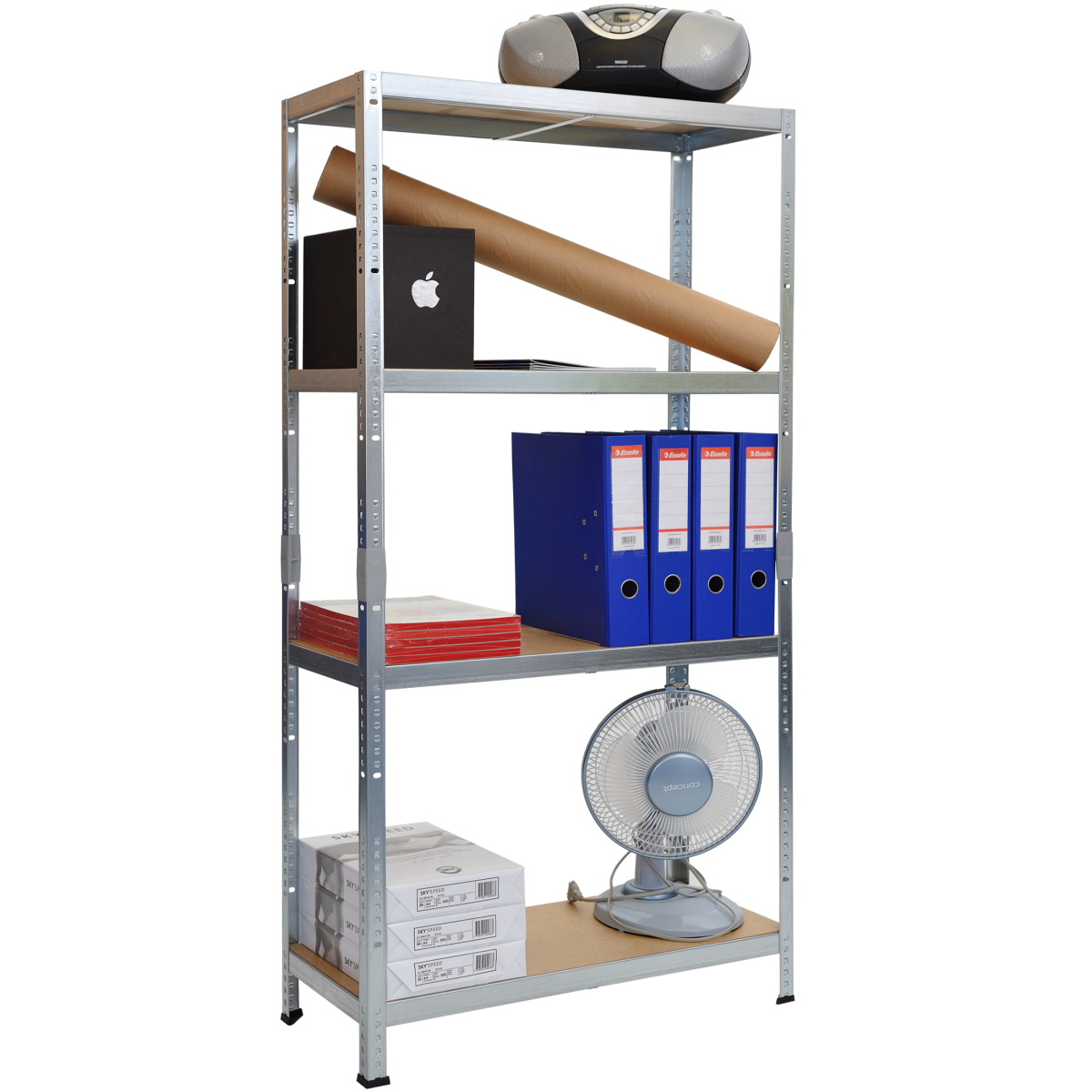 Fémpolc, horganyzott, 4MDF polccal, allítható polcmagasságok, csavarozásmentesen összeszerelhető. Mérete: 70x138x30 cm, max teherbírás: 50kg/polc. Csomagolási méret: 71x31x6 cm, 5,7 kg.