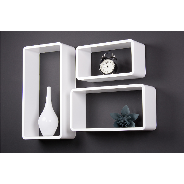 Fali polc szett, "Trio", 3 részes 50x30x15 cm, 40x25x15 cm, 30x20x15 cm, fehér színben.