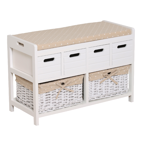Fehér fa tárolós ülőke, 4 fiókkal 2 kosárral.