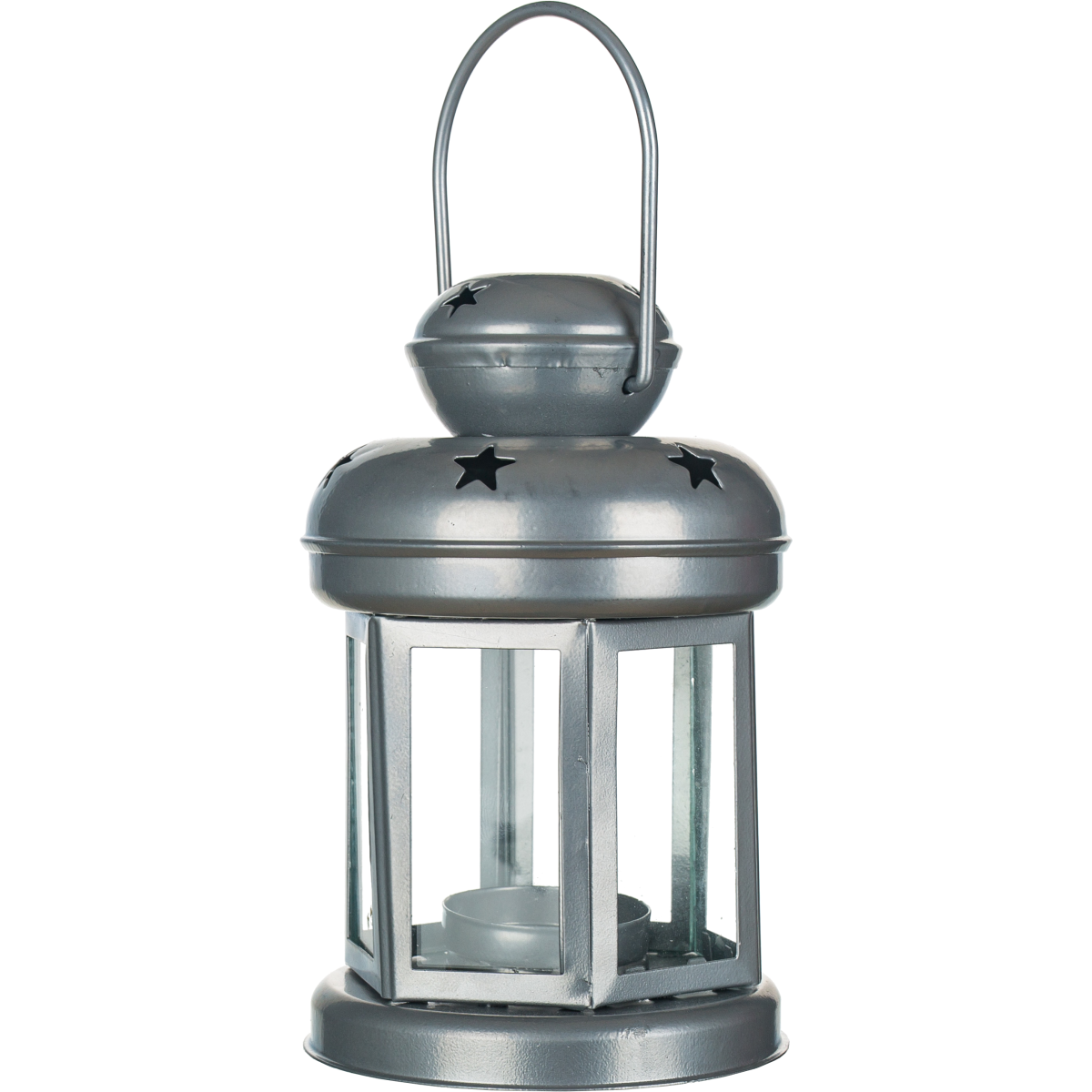 Fémlemezből készült, ezüst színű, kisméretű kerti lámpás. A lámpás praktikus akasztójának köszönhetően felakasztható.